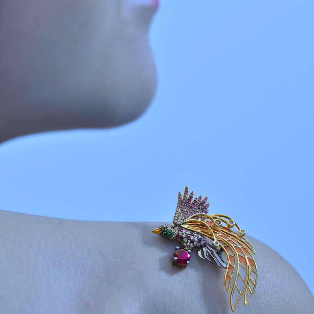 ALFINETE ( BROCHE ) PRATA 925% BANHADA OURO PAVÃO REAL ZIRCONIAS