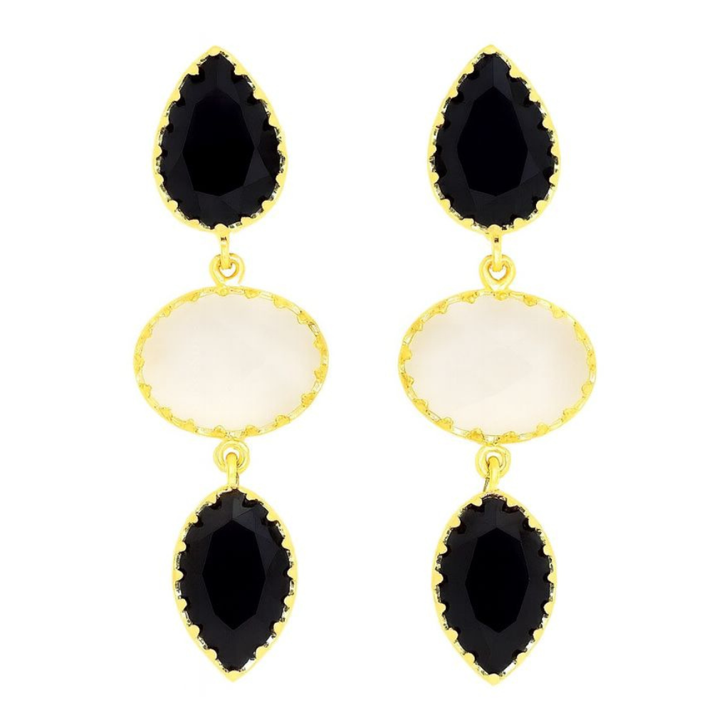 BRINCO EM PRATA DOURADA 925% COM 3 PEDRAS PRETO E BRANCO