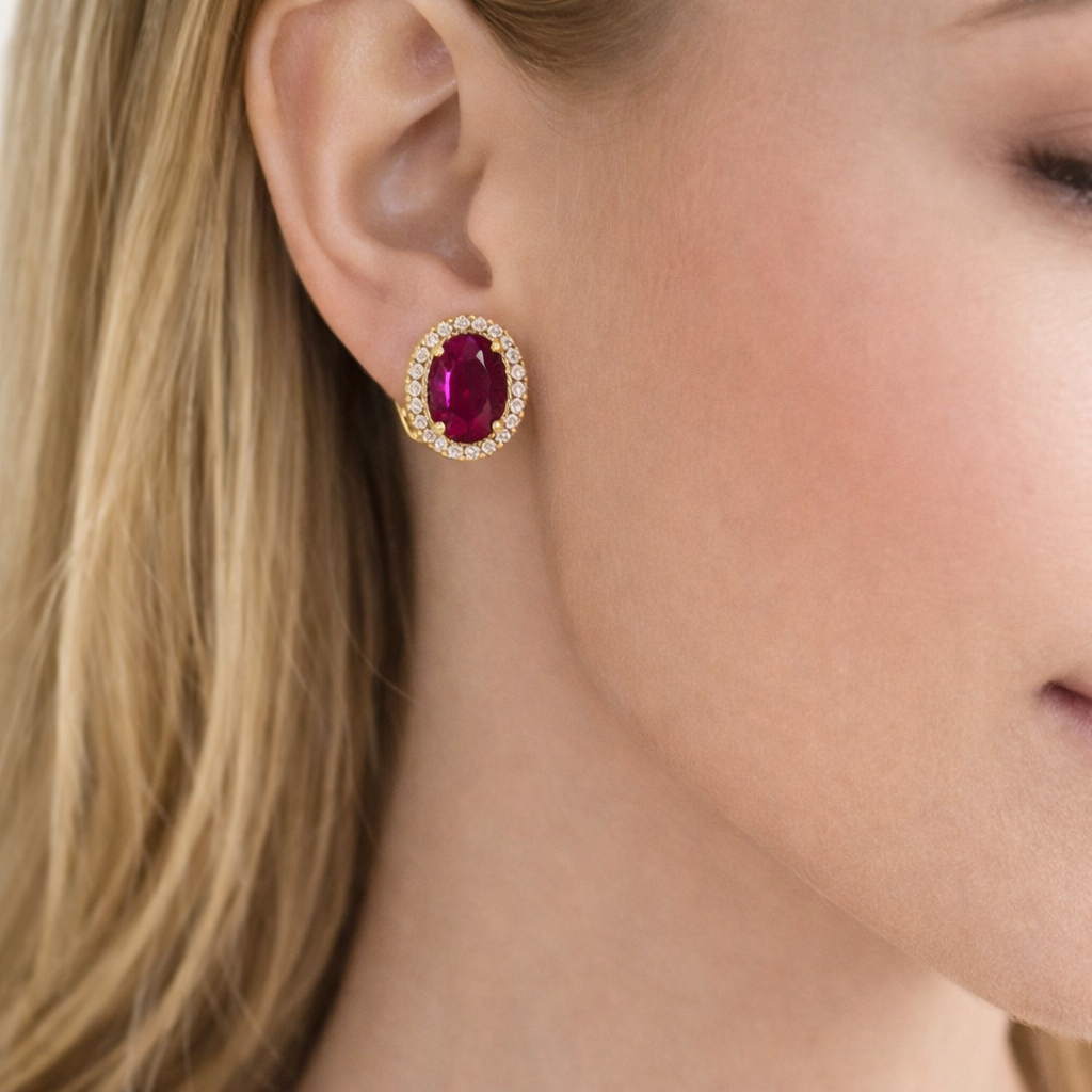 BRINCOS EM OURO COM ZIRCONIAS E PEDRA VERMELHA